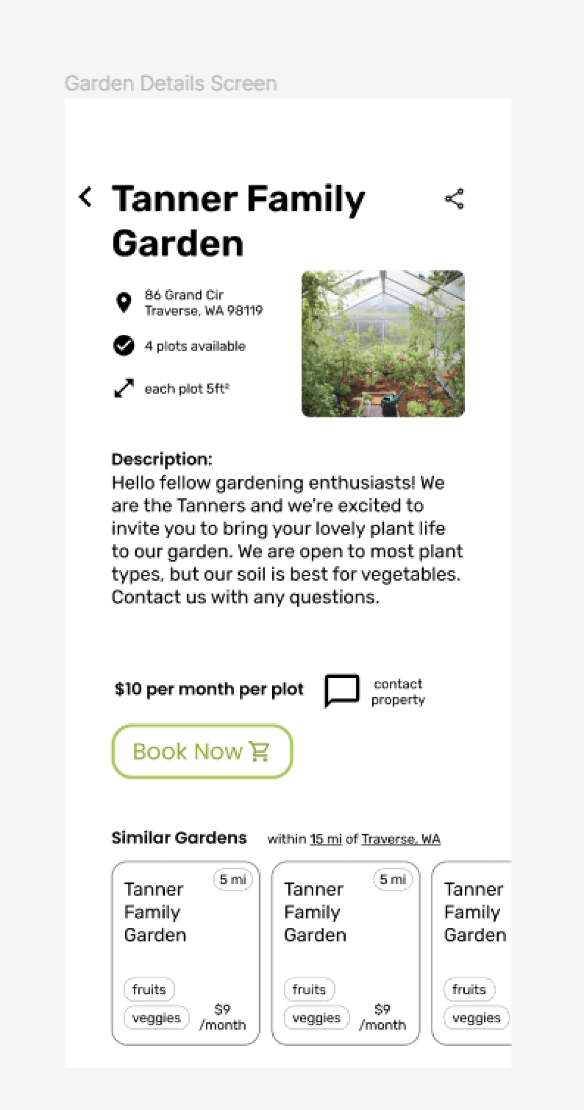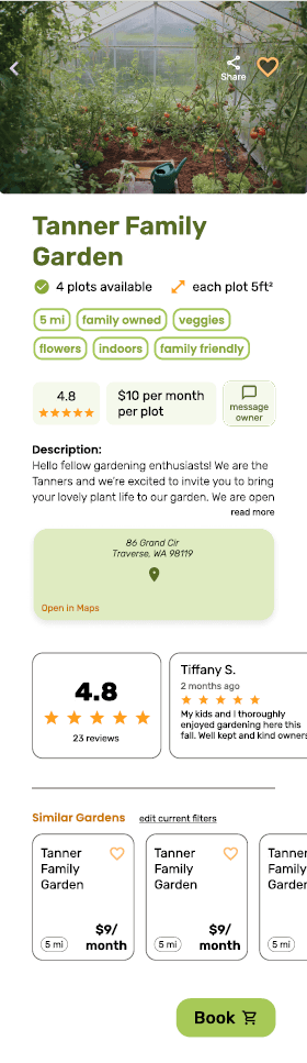 The third scenario was trickier to find an easy solution. Despite the inconvenience, the simplest option would be to contact the owner since the issue is less of a common one. Or during the booking process or on the description page there could be an option to see what others are growing in each plot.