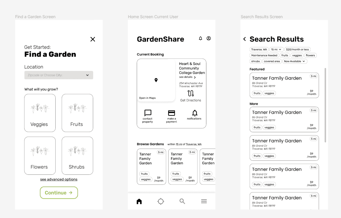 For the first round of testing, the first scenario included finding a community garden specifically, and one that is more full. For this user, type of plant grown is less important than having an option for a filter that you can see only community gardens.